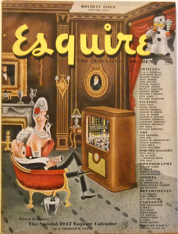 | 01/47 | Article about Governor Huey Long of Louisiana and another long article about Uruguay - The Switzerland of South America. The Esquire Gallery - Full pg Illustrations - 'Preoccupation' by Fritz Willis & 'Admiration' w/ Joe de Mers, 'Soubrette' by Tom Hall plus the 1947 Esquire calendar - 12 full pg illos (6 double-sided pgs) by J. Frederick Smith. Book Nice VG+, Calendar and Artwork in excellent shape @ 40.00 (View It!) |
