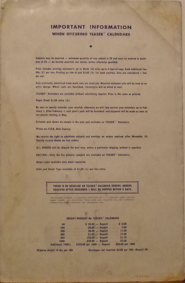 | 1951 | WALL CALENDAR. All Al Moore. Calendar in nice shape, January page has minor signs of handling and small spot on bottom edge, cardboard backboard has light corner creases and a few stresses. Envelope has been heavily handled, edges are rough but sides and bottom have not been split. $40.00 (View It!) (View Envelope!) |