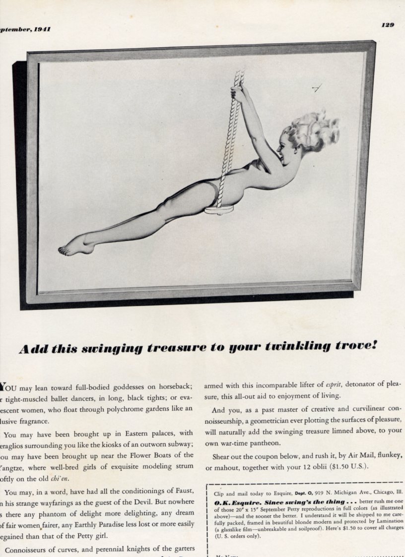 | 01/56 | Mag contains a George Petty Portfolio - 12 images on 6 double-sided pgs - 1/2 pg each. Mike Ludlow has a full pg illo and E. Simms Campbell has a full pg cartoon. Articles about Ingrid Bergman, marked cards and New York City's Plaza Hotel. Plus an essay by Aldous Huxley 'Variations on a Musical Theme'. Book has a bit of normal wear but no serious defects - VG/VG+. Petty artwork in very nice shape @ $40.00 (View It!) |